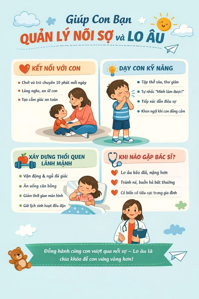 Bạn là người hiểu con nhất. Đừng ngần ngại nói chuyện với bác sĩ nhi khoa hoặc chuyên gia tâm lý nếu bạn nghĩ con cần thêm sự hỗ trợ. Sự đồng hành và kiên nhẫn của cha mẹ là chìa khóa để giúp con vượt qua nỗi sợ và lo âu một cách bền vững